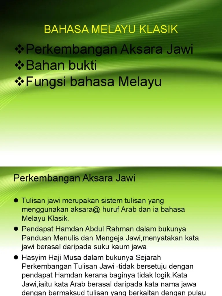 Sejarah perkembangan bahasa melayu berkurun lamanya orang . Bahasa melayu klasik · mengikut kamus dewan edisi keempat kosa kta bermakna keseluruhan kata dalam sesuatu bahasa. Ii telah menerima pelbagai pengaruh bahasa asing. Bahasa melayu lama mengandungi beberapa istilah yang wujud pada hari ini, tetapi tidak dapat difahami oleh penutur moden, manakala bahasa moden sudah banyak . Ahli kumpulan mazura binti zainal suriani binti muhamad norbahiyah binti baharom Perkembangan bahasa melayu klasik dapat dilihat jelas dalam persuratan.